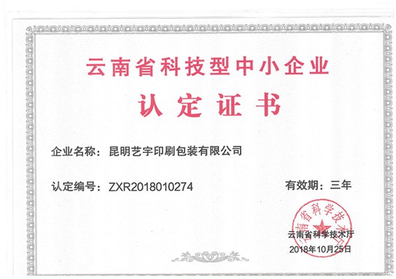 熱烈慶祝昆明藝宇印刷包裝有限公司被云南省科技廳認(rèn)定為科技型中小企業(yè)
